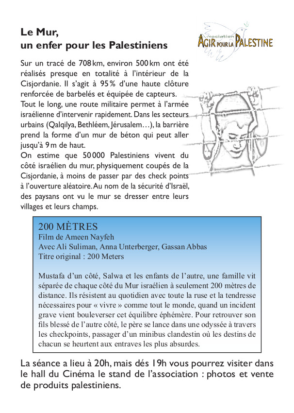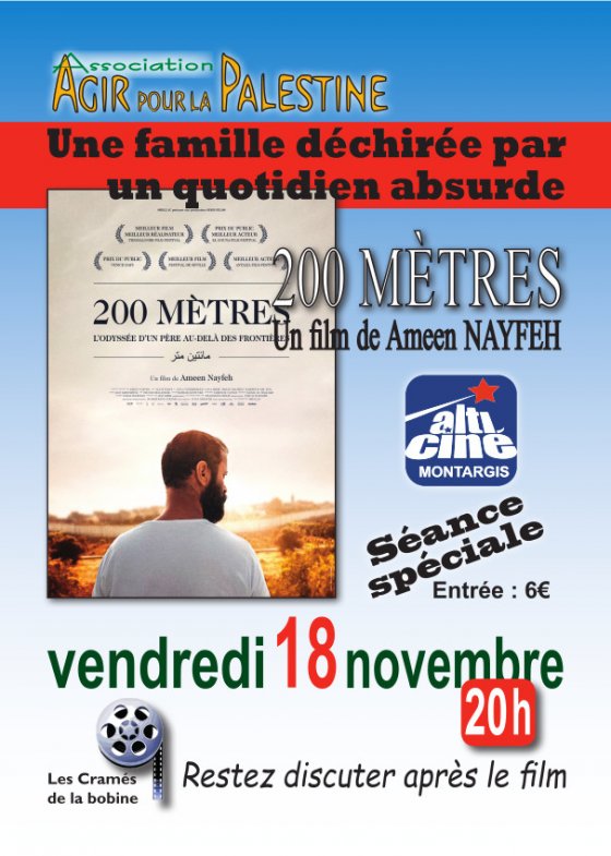 Le 18 novembre à 20h Agir pour la Palestine présente le film "200 Mètres" à l’Alticiné